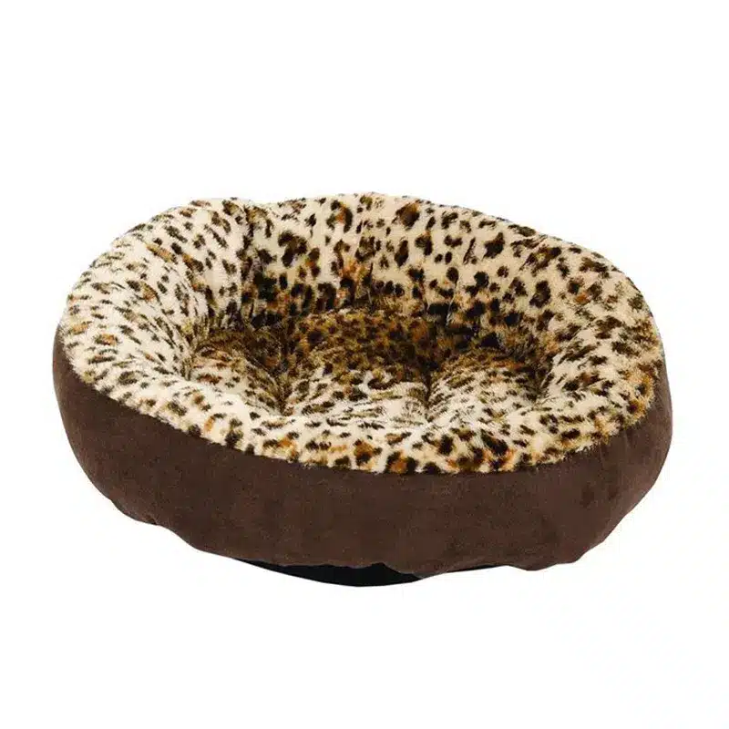 Cama especial para animales pequeños, en forma redonda. Con tela en diseño animal print y tela antideslizante por debajo.