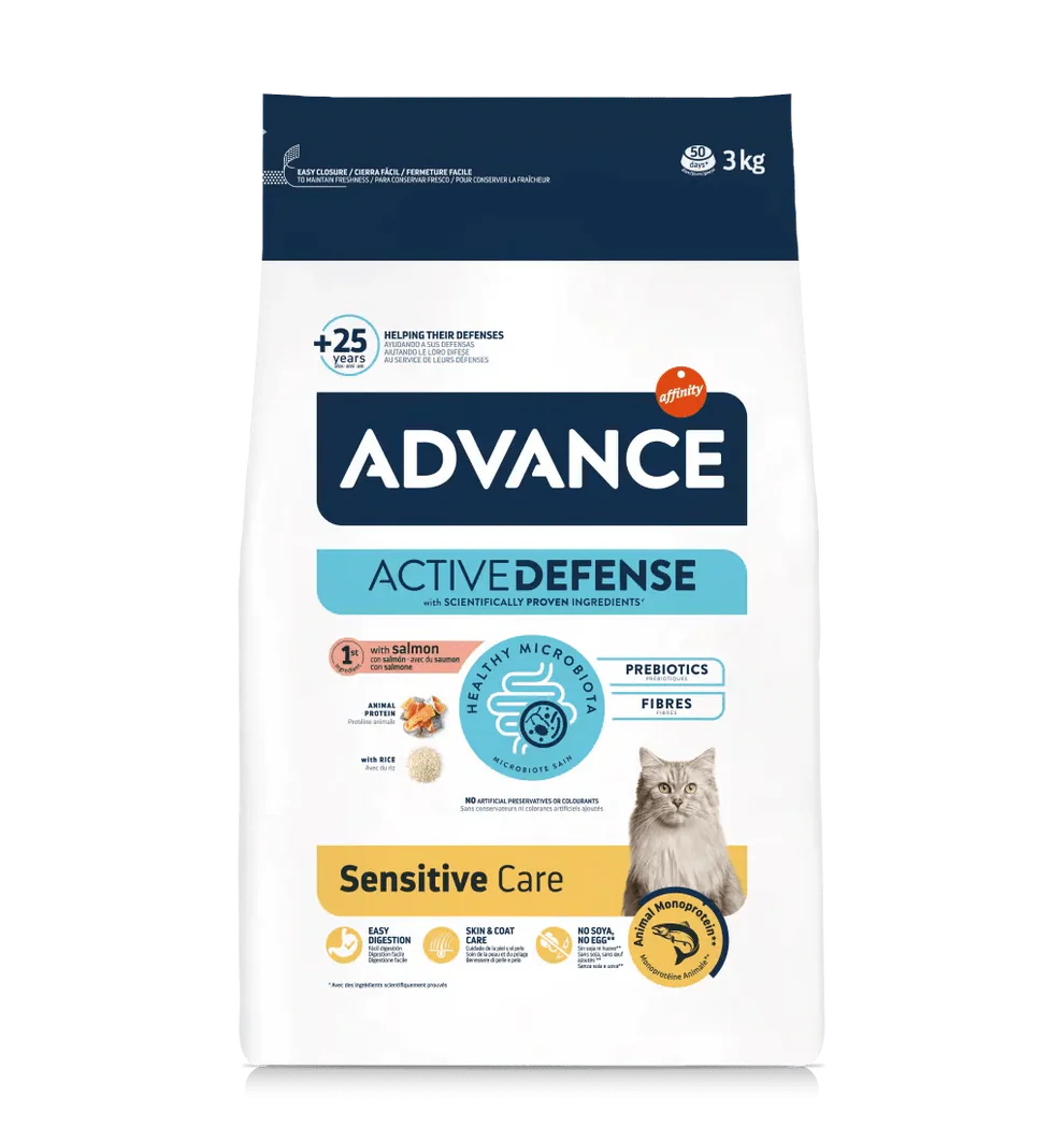 Advance Sterilized Adult Sensitive está especialmente indicado para ayudar a la digestión de los gatos adultos esterilizados.Está elaborado con salmón como única fuente de proteína animal y con arroz. Una receta monoprotéica animal fácil de digerir, formulada sin ingredientes que contienen gluten, soja o huevo soja ni huevo. Además, ayuda a controlar el peso gracias a su contenido en fibra, y un nivel moderado de grasas y calorías. Contribuye a una piel saludable y un pelo brillante gracias a los ácidos grasos omega 6 y 3 , omega 3 y al zinc. El tamaño de su croqueta se adapta a la mandíbula de los gatos adultos.